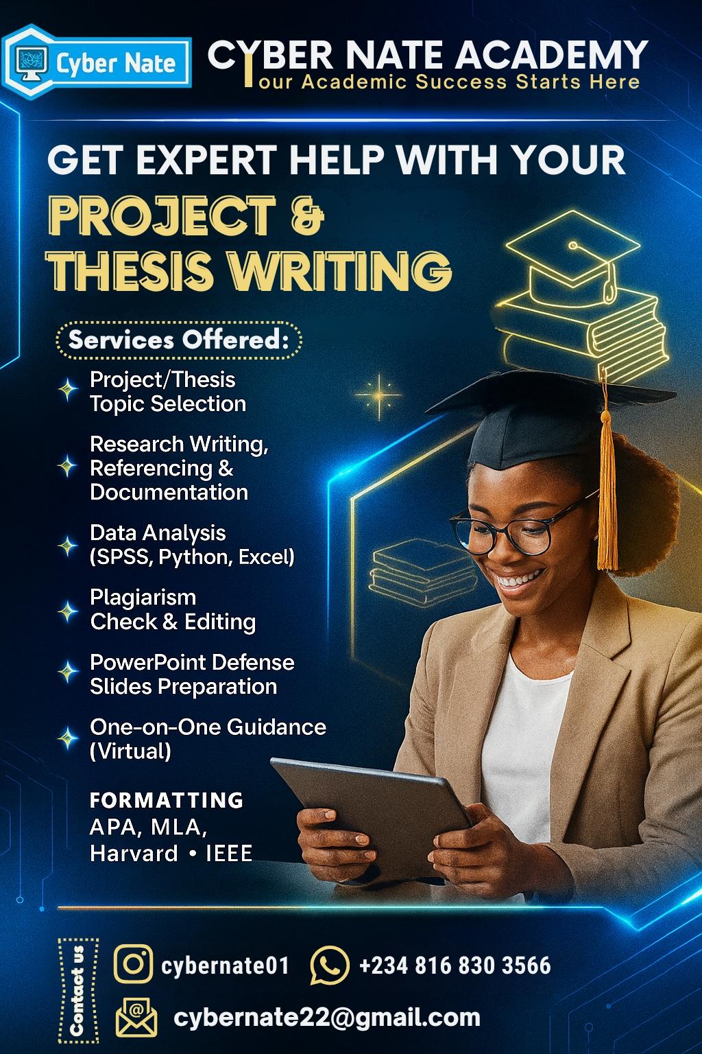 At Cyber Nate, our Project/Research Writing service offers expert assistance in developing well-researched, structured, and coherent academic papers and projects. Whether you are a student seeking guidance for your thesis, dissertation, or any other academic work, our experienced writers are here to help you navigate the complexities of research and writing. We ensure that your work meets all academic standards while enhancing your understanding of the subject matter.